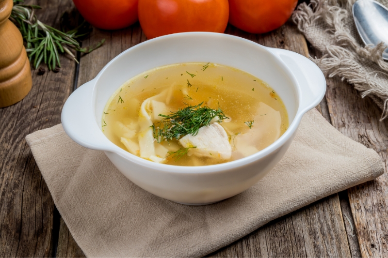 Đây là món ăn bổ dưỡng phù hợp cho trẻ đang phát triển hoặc trẻ bị suy giảm hệ miễn dịch. Ngoài bổ dưỡng, chúng còn có công dụng duy trì độ ẩm cho đường thở và giúp tan đờm. Cha mẹ nên cho bé ăn súp gà từ 2 đến 3 bữa/ ngày trong giai đoạn trẻ bị bệnh, và hoàn toàn có thể trộn thịt gà với các thực phẩm tiêu đờm khác như tỏi, gừng để giúp trị đờm hiệu quả hơn.
